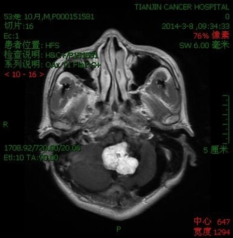 病例一:张**。女性,52岁。查体发现枕骨大孔区占位入院。临床诊断:枕骨大孔区腹侧脑膜瘤。术式:远外侧入路。术后病理脑膜瘤。