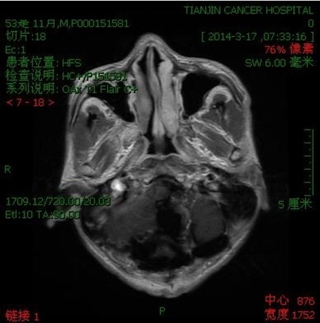 患者临床表现复杂多样,缺乏特征性的症状体征,因而容易误诊为颈椎病等。常见症状和体征包括头颈痛、肢体无力、感觉缺失、吞咽困难等,头颈部疼痛最常见,常为首发症状,多为锐痛,头颈运动时疼痛加剧。继而可出现深感觉即关节位置觉、震动觉的丧失和肢体的强直痉挛、无力,多先发生于同侧上肢,而后呈顺时针方向影响四肢。其中上肢位置觉、震动觉不对称性缺失具有相对特异性。后组颅神经中舌咽、迷走和舌下神经常受累,副神经症状少见,可表现为吞咽困难、言语不利、间歇式呼吸,亦有以口腔溃疡为首发症状的报道。椎基底动脉系统由于受肿瘤压迫、牵拉可表现短暂性或周期性症状,如跌倒发作、偏头痛等。