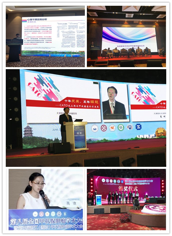 | 2018年6月22~23日,第八届全国甲状腺肿瘤学术大会暨第四届浙江(国际)甲状腺肿瘤学术大会在杭州召开。本次大会以“科学探索,协同创新”为主题,邀请国内外知名甲状腺肿瘤专家,共同探讨甲状腺肿瘤诊治的新理念,新发现,新技术。大会荣幸地邀请到来自国内外近千多名的甲状腺肿瘤专家及相关领域的知名学者出席会议,我科多名医生护士受邀参会并做大会发言。本届大会主席,中国抗癌协会甲状腺癌专业委员会主任委员我科高明教授进行了题为《十年发展,五年崛起-CATO成立期间甲状腺癌诊疗进展》的主题演讲,回顾了中国抗癌协会甲状腺癌专业委员会成立以来我国甲状腺癌诊疗的飞速发展,郑向前主任对《索拉非尼治疗晚期分化型甲状腺癌的临床研究》进行了全面阐述,王欣护士长的《甲状腺癌患者围术期心理护理》在护理与康复论坛进行发言,郑向前主任以及王欣护士长参加《快速康复外科在甲状腺外科应用设想》的大会讨论,高婕护士的《一例甲状癌侵犯气管行气管袖状切除患者的护理》进行发言,同时我科研究生侯秀坤的《HBXIP通过调控MEK1介导甲状腺乳头状癌进展的分子机制研究》参加青年甲状腺临床及科研大赛基础研究大赛并获得三等奖。此次会议充分体现了我院甲状腺颈部肿瘤科在甲状腺肿瘤专业的重要学术地位和学术影响力,也进一步推动了我院甚至我市甲状腺专业的发展。