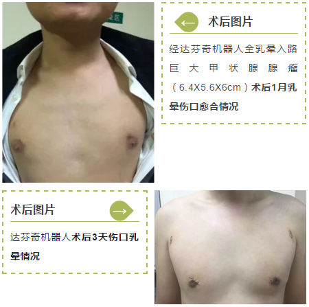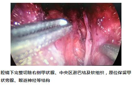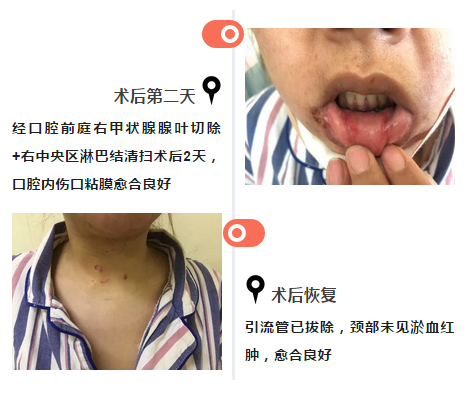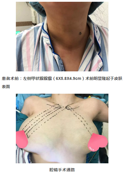 患者术后恢复良好,远期吞咽不适、声音嘶哑等常见并发症均低于开放手术,随后开展了腔镜下经全乳晕入路巨大甲状腺肿瘤切除术、甲状腺癌根治术等。