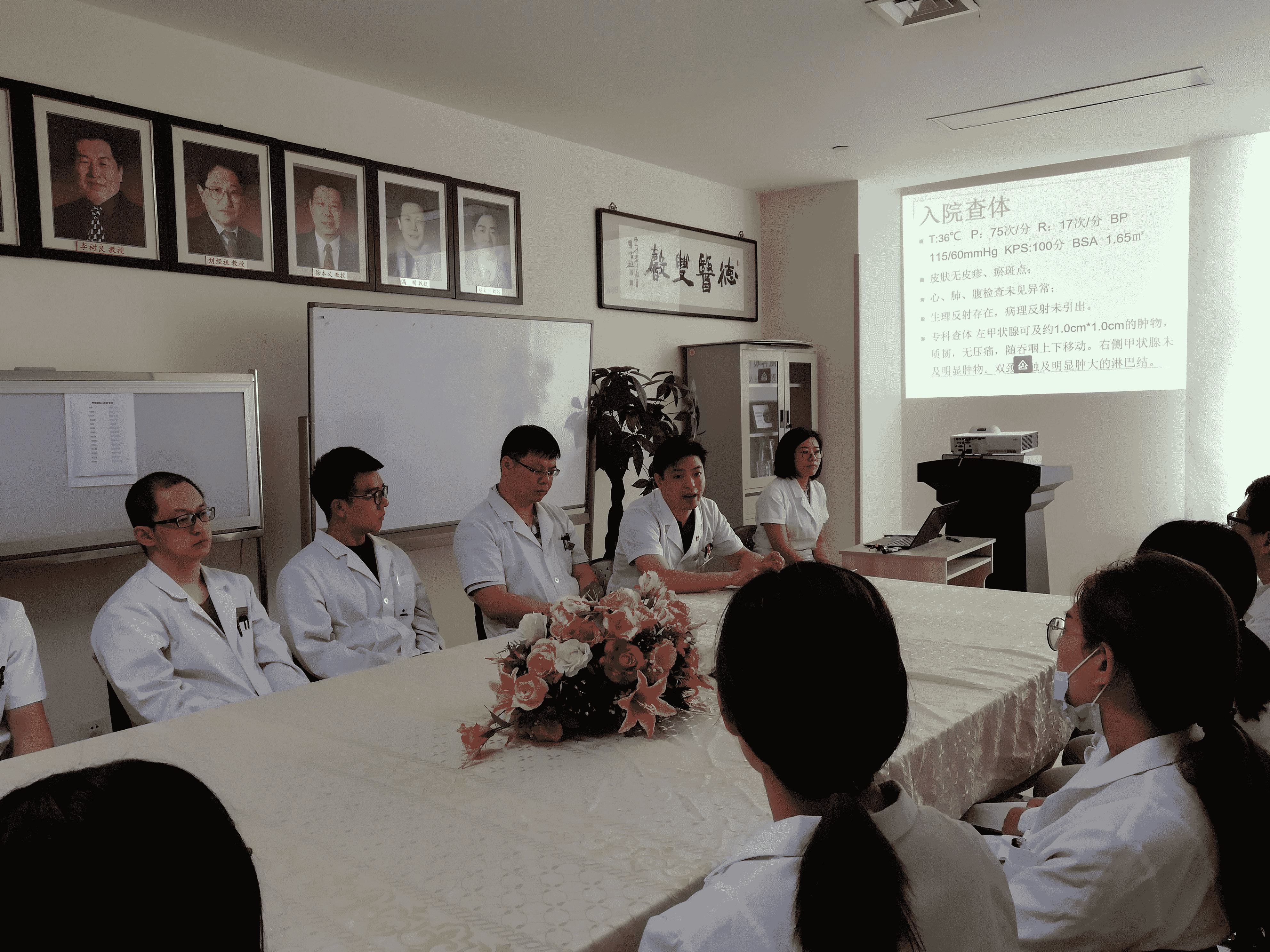 | 2019年6月26日上午甲状腺颈部肿瘤科开展主题为“甲状腺癌诊断与治疗”教学查房。主查医师是甲状腺颈部肿瘤科郑向前主任,住院医生是运新伟医师,学生是王会娟。本次查房邀请了天津医科大学总医院纪岩文主任和天津医科大学第二医院何屏主任做点评专家,进修生、住院医师规培学员、博硕士研究生及本科室相关医护人员参加了此次教学查房。