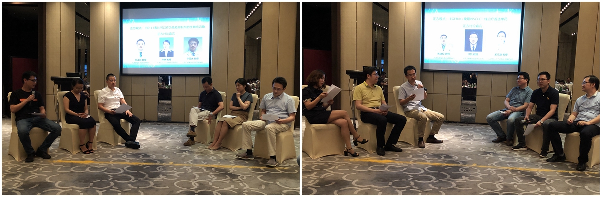 在下半场百家争鸣部分,第一环节是天津肿瘤医院宋勇春引导发言,提出了PD-L1表达是否能作为免疫抑制剂最佳的生物标记物的讨论题目,来自天津胸科医院、天津市总医院医院等多家医院的中青年专家各抒己见,发表了自己的看法与见解。第二环节是天津肿瘤医院李燕巍引导发音,提出EGFRm+晚期NSCLC一线治疗单药还是联合用药的问题,多家医院的专家从正反方进行辩论,阐述了自己的用药观点及经验,形式新颖独特,极大的激发了大家的讨论热情。