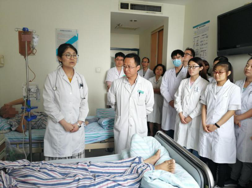 床旁查体结束后,邓主任用PPT形式讲解病例,结合病例特点与同学们进行讨论总结,突出重点难点。在整个讨论过程中,邓主任围绕本病例的特点,用启发式教学,以问题为引导,调动学生的兴趣与临床思维,培养他们独立思考和独立诊治疾病的能力。整个教学查房过程规范有序,讲解精彩,师生讨论互动热烈。