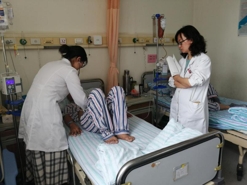 住院医师宁涛补充病历,主查医师邓婷主任审阅大病历,对学生查体手法进行纠正,引导学生开拓床旁思维。