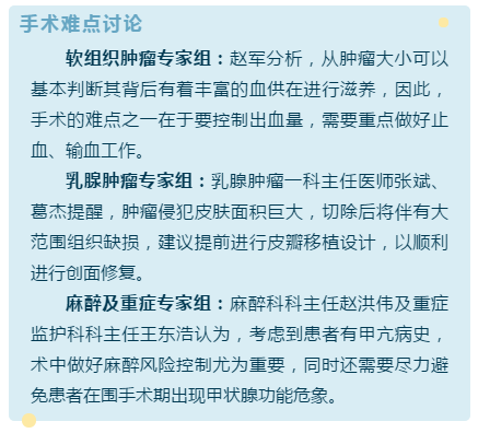 如此巨大的胸壁肿瘤在临床中非常少见,经科室集体讨论后,决定联合乳腺肿瘤一科、病理科、输血科、介入治疗科、放射科、感染科、手术室、重症监护科等科室专家,为患者进行多学科会诊,制定个性化诊疗方案。