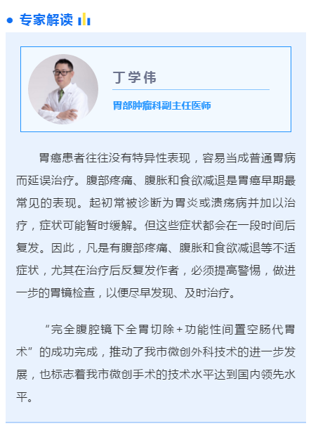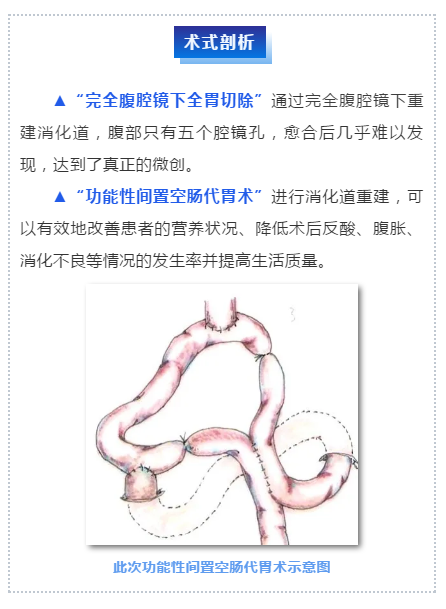 考虑到患者自身特点和表达出的诉求,丁学伟副主任医师建议患者可以接受“完全腹腔镜下全胃切除+功能性间置空肠代胃术”。