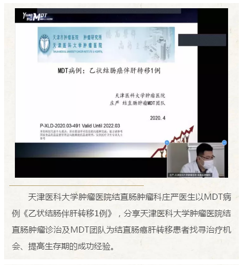 天津医科大学肿瘤医院结直肠肿瘤科孔大陆、内镜诊疗科周德俊、消化肿瘤内科李鸿立、放射科肖渤瀚、放疗科张柏林、生物治疗科韩颖、病理科臧凤琳、肝胆肿瘤科张倜、介入肿瘤科于海鹏、肺部肿瘤科岳东升、中西医结合科兰岚、分子影像及核医学诊疗科戴东、结直肠肿瘤科刘嘉参加线上MDT,分别从各自专业出发,为6位结直肠肿瘤典型病例开展多学科会诊,提供专业化的诊疗方案。本次线上MDT活动截至直播结束累计观看达4551人次,获得了广大同行及患者的广泛好评。