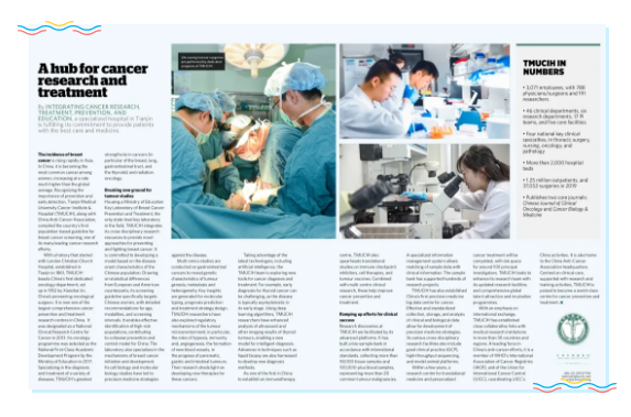 | 多年来,天津医科大学肿瘤医院不断提升科研实力,加快交流与合作步伐,影响力进一步扩大,吸引国际视野关注。国际顶尖科学杂志NATURE在2020年4月23日出版的Nature Index on Cancer中,刊发了医院专题报道,内容涵盖医院发展现状、优势特色学科、人才团队储备、科研平台建设、国际交流合作、未来发展方向等,并重点介绍了医院在肿瘤预防模式建立、发生发展机制探索,诊断和治疗新技术研发以及多中心临床研究开展方面取得的重要进展。
