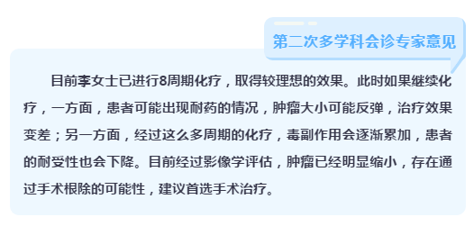 患者的化疗取得了良好的治疗效果,通过检查评估肿瘤也已经明显缩小,此时到底是继续化疗还是选择手术治疗又成为了需要慎重选择的一个问题。为全面评估当前治疗效果,稳妥推进后续治疗,专家们再次为李女士进行了MDT(多学科会诊)。