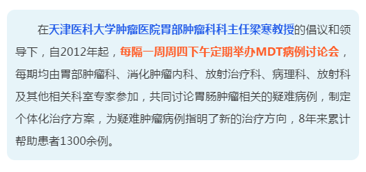 胃癌的治疗是以手术为主的综合性治疗,尤其对于相对晚期的胃癌患者,不能单纯考虑手术治疗或包括化疗、放疗、靶向治疗等在内的保守治疗,需要多学科专家联合讨论,共同明确治疗方向、治疗手段的前后顺序、更换治疗方案的时间点等关键性问题。晚期患者的良好治疗效果,离不开治疗团队的不懈努力,离不开患者及家属的积极配合,也离不开MDT讨论会制度的规范化实施。