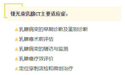 相对于其他检查项目,锥光束乳腺CT检查无需对乳房进行挤压,辐射低,可实现增强扫描,尤其适用于对早期乳腺癌微小病灶全面而准确的发现与诊断。