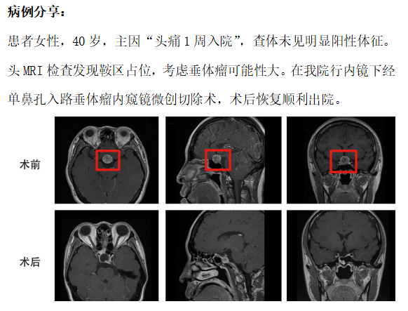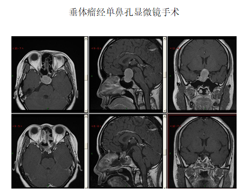 目前除了泌乳素瘤可以尝试药物治疗,其他类型垂体腺瘤及药物治疗无效的泌乳素型垂体瘤,手术仍是首选的治疗方法。目前垂体瘤多可采用经鼻内窥镜辅助下微创手术治疗,与传统显微手术比较, 该方法将内镜作为照明和观察设备,其优点是为术者提供了较显微镜更清晰的术野, 角度内镜为术者提供的“全景式”视野解决了手术显微镜的手术死角和盲区问题。另外内镜手术可以利用自然腔隙,具有不用开颅,并发症少,患者住院时间短,不会影响患者美容,对患者工作生活影响小等优点。