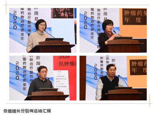 肿瘤化疗药物副作用管控项目组组长、天津医科大学总医院张琳琳教授,肿瘤免疫治疗副作用管控项目组秘书长、天津医科大学肿瘤医院张维红教授,肿瘤药物性心脏损伤管控项目组组长、天津人民医院王凤玮教授,肿瘤免疫治疗副作用管控项目组组长、天津医科大学总医院钟殿胜教授,分别对学组的工作进行了总结汇报,并由天津医科大学肿瘤医院中西医结合科科主任,潘战宇教授做安全年总结回顾。本次会议同时对表现突出的个人和团队进行了表彰,并为各协作组成员单位举行了授牌仪式。