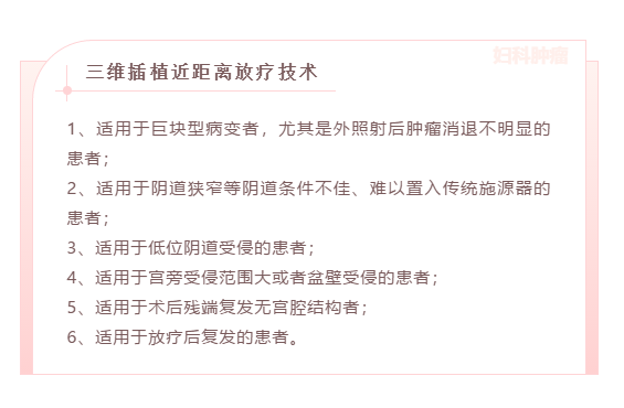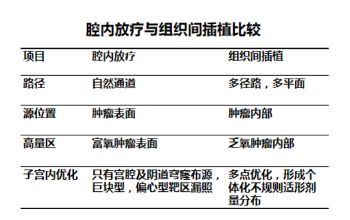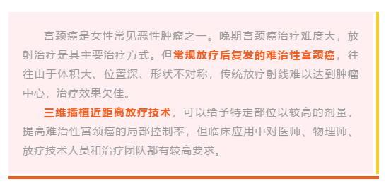 在常规采用的二维腔内后装放疗技术中,放疗靶区剂量不足可能是宫颈癌复发的重要原因之一。而组织间三维插植近距离放疗技术,是结合现代CT、MR等定位引导影像系统,将作为施源器的插植针直接插入肿瘤中心进行放射治疗,打破了解剖结构的限制,与既往二维腔内后装放疗相比具有明显的优势。