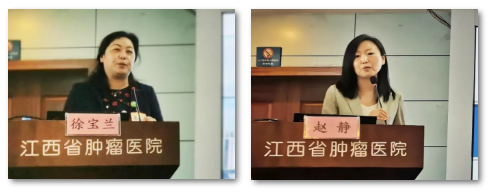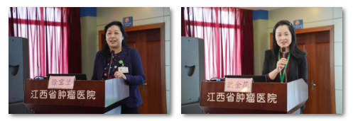 江西省肿瘤医院护理部副主任洪金花主持《中国癌症症状管理实践指南》巡讲会。徐宝兰主任、李金高副书记、黑静副院长进行巡讲会致辞。