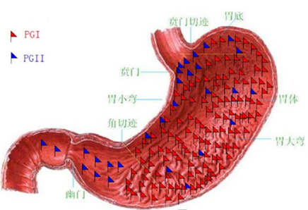| 胃蛋白酶原(pepsinogen):由泌酸腺的主细胞合成,在胃腔内经盐酸(HCL)或已有活性的胃蛋白酶(pepsin)作用变成胃蛋白酶,分解蛋白质。该酶作用的最适pH为2,进入小肠后,酶活性丧失。胃蛋白酶原是胃蛋白酶的前体,根据其生化性质和免疫原性将其分成2个亚群,分别为胃蛋白酶原I、胃蛋白酶原II,而PG I主要由胃底腺的主细胞分泌,PG II由胃底腺(胃底和胃体部)、喷门腺、幽门腺所分泌(见左图1)。PG分泌区域较大,但浓度相对较低通常情况下,约有1%的PG透过胃黏膜毛细血管进入血液循环,进入血液循环的PG在血液中非常稳定。血清PG I和PG II反映胃黏膜腺体和细胞的数量,也间接反映胃黏膜不同部位的分泌功能。当胃黏膜发生病理变化时,血清PG含量也随之改变。因此,监测血清中PG的浓度可以作为监测胃黏膜状态的手段。