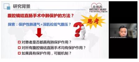 中国医学科学院肿瘤医院麻醉科主任郑晖教授带来的话题,内容围绕中科院肿瘤医院麻醉科目前进行的大样本临床研究展开,该研究对腹腔镜结直肠肿瘤手术不同麻醉策略下,不同人群所呈现的术野暴露问题、患者术后呼吸系统不良事件、感染率和其他系统并发症等方面进行了深度探讨。