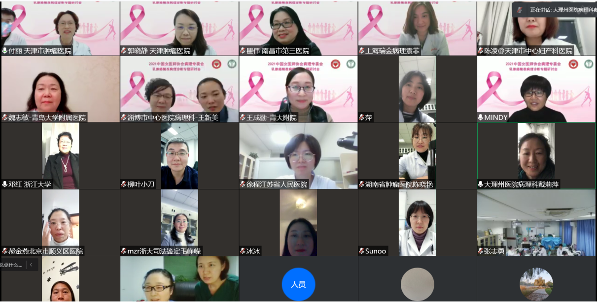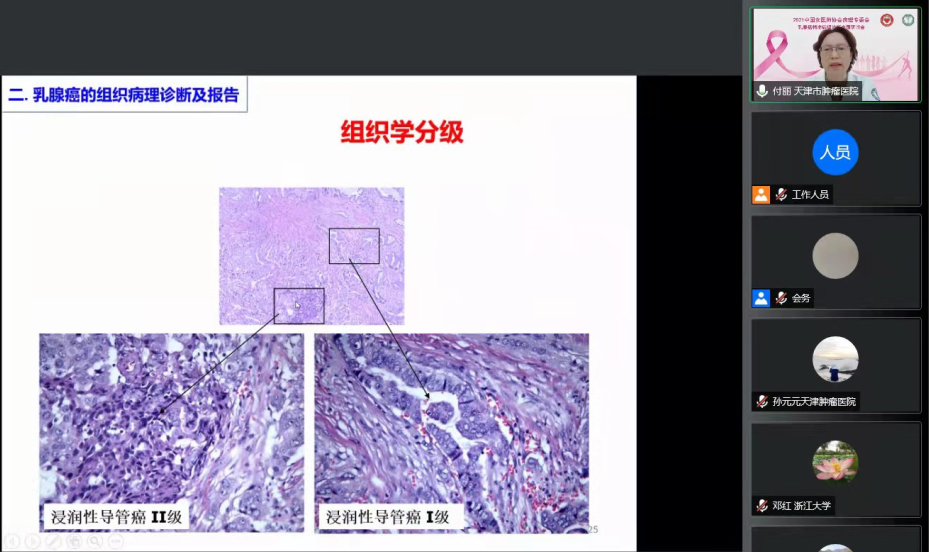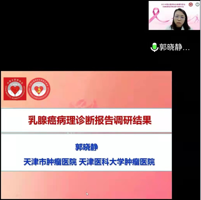 | 中国女医师协会病理专业委员会,在协会的鼎力支持下,申请获得了“我国三级甲等医院乳腺癌病理诊断现况调研”的国家继续教育项目并获得批准。项目调研过程中,共获得10余家单位病理科提交的乳腺癌(包括根治术标本、保乳手术标本、穿刺标本和冰冻标本)病理诊断报告200余份。专委会就各单位各类乳腺癌标本病理诊断报告的内容、形式进行了阅读评估和总结。为了更广泛深入地交流,在付丽主委的主持领导下,于2021年12月14日举办了线上专题研讨会。