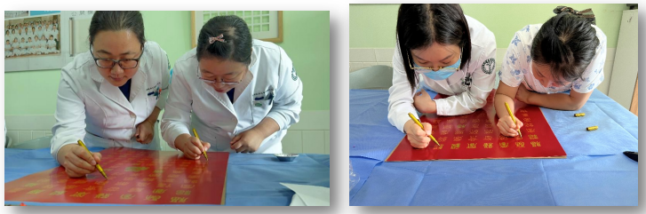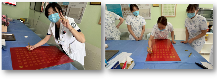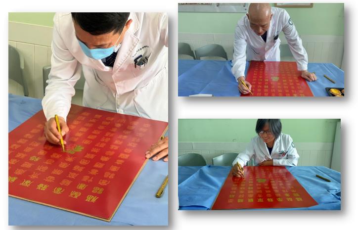 李雅楠老师组织大家庭的每一位医护人员用金色的颜料笔齐心描绘《百福图》。福者,备也;备者,百顺之名也;无所不顺者谓之备。言内尽于己,而外顺于道也。百福图百体并举,美不胜收,聚心斋小家家长任秀宝主任勇挑重担绘制最大“福”字,祝福大家百福纳祥,万事顺意。