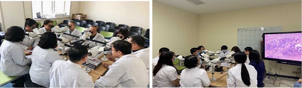 教学制度完善。本基地以住院医师规范化全过程管理为基础,为住院医师设计了一套体系完善、收效显著的特色培训计划。课程设置规范,包含理论,实践及沟通等内容。所有带教老师均配有双人或三人共览显微镜,日常教学采取“一对一”及轮转制。“一对一”实现了镜下实时带教、随时解决住院医师的疑问,收到了良好的教学效果。本基地实行导师负责制,由导师对住院医师提供更个性化的指导、承担住院医师培养责任,为切实提高教学质量、培养高质量的临床病理医师奠定坚实的基础。基地安排每周小讲课、疑难病理读片讨论各一次,每两周病理诊断系列讲座一次。安排学员进入取材初诊排班,并提供条件给学员开展临床病理研究。